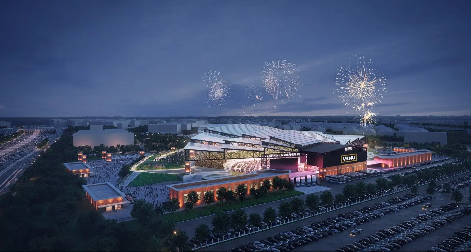 As the flagship venue for VENU, the Sunset Amphitheater will offer a world-class experience for music lovers, with its iconic roof structure, luxury suites, and exceptional amenities. The strategic location and thoughtful design ensure that it will be a premier destination for live entertainment in North Texas.